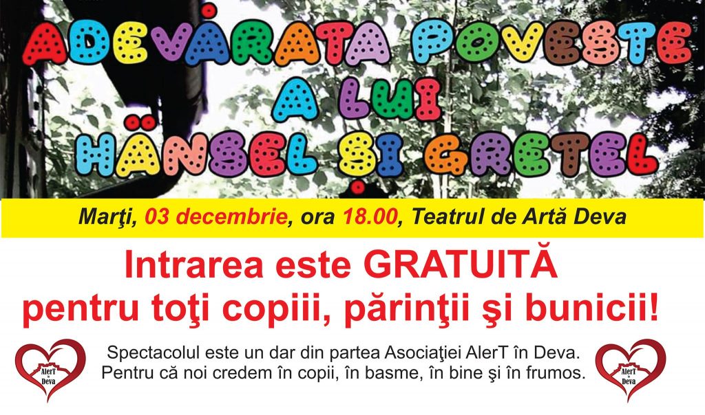 Sub sloganul “Pentru că noi credem în copii, în basme, în bine şi în frumos”, marți, 3 decembrie, de la ora 18:00, așteptăm copiii însoțiți de parinți, frați sau bunici la Teatrul de Artă Deva pentru un eveniment inedit!